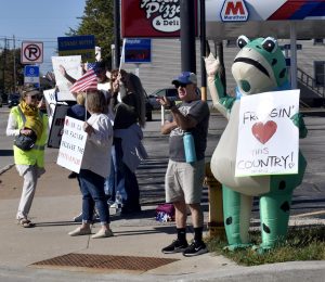A protestor in an inflatable frog costume holds a sign that says, “I froggin’ love this country, do you?”