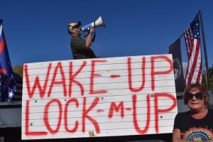 A protestor blow bubbles at other protestors while others hold a large sign that says, “democracy.”