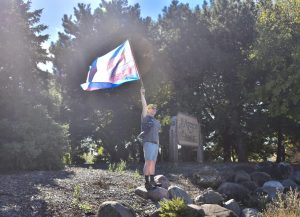 Fourth-year environmental studies major at UW Oshkosh Penelope McPhee holds a transgender flag at the protest. “I’m scared,” McPhee said. “I’m only able to go to school through the GI bill because I’m an honorably discharged veteran, so if they decide I wasn’t fit to serve because I’m trans, I can lose everything.”